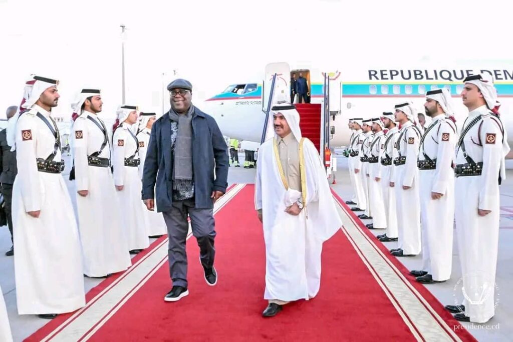 Le Chef de l’État de la République Démocratique du Congo, Félix Antoine Tshisekedi Tshilombo, a effectué son tout premier déplacement de l’année 2025, ce dimanche 05 janvier 2025, dans la matinée, en direction de Doha, capitale du Qatar. Selon une dépêche de la présidence de la RDC, le Président de la République s’y est rendu pour un bref séjour de travail qui a conduit à un tête-à-tête, le même dimanche au Palais royal de Doha, avec l’Emir du Qatar, son Altesse Cheikh Tamin Bien Hamad Al Thani, en compagnie de l’ambassadrice de la RDC dans ce pays.