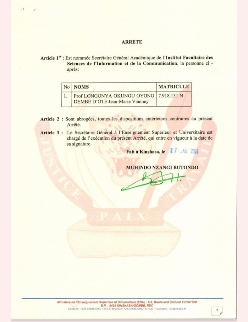 Il se passe toujours quelque chose à l’Ifasic…Chers tous,Par l’arrêté ministériel numéro 059/MINESU, du 27 janvier 2024, le Professeur Jean Marie Vianney Longonya Okungu Dembe D’hôte a été nommé Secrétaire général académique de notre notre Alma mater.Sincères félicitations et fructueux mandat à lui.